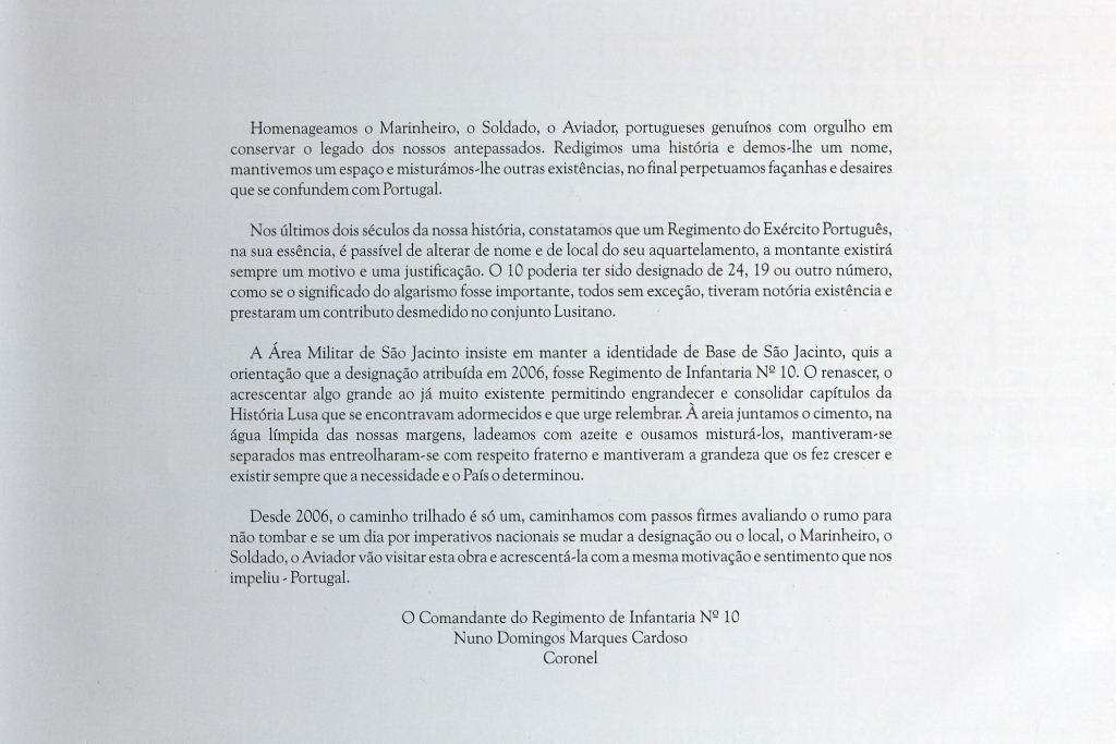 O percurso pela história do Regimento de Infantaria n.º 10 do Exército Português, nas suas diferentes localizações e organização, desde 1806 até 2013, bem assim como aquilo que foi a vida das unidades militares da Marinha e da Força Aérea que construíram e desenvolveram as instalações militares de S. Jacinto, entre 1918 e 1993, é, talvez, uma das maiores evidências de que no essencial, contra ventos e marés, na monarquia como na república, na ditadura como na democracia, a “força militar” mesmo tendo as armas nas mãos, não resiste à mudança e, certamente como nenhum outro sector do Estado, adapta a sua organização às necessidades definidas pelo poder político, pareçam-lhe elas, ajustadas ou não. Ou seja, estão realmente ao serviço de Portugal.